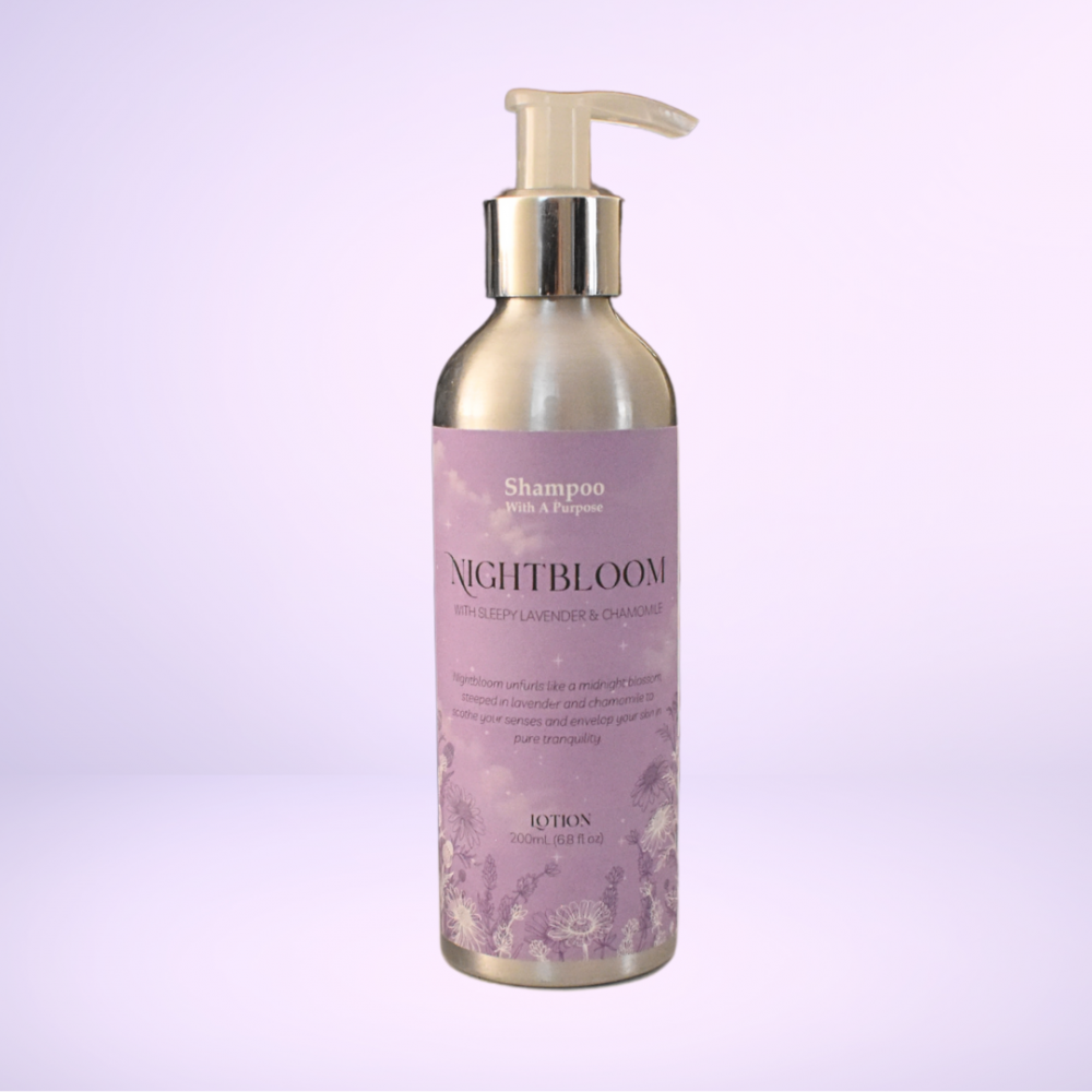 Nightbloom unfurls like a midnight blossom, steeped in lavender and chamomile to soothe your senses and envelop your skin in pure tranquility. Nightbloom 200mL Lotion deeply nourishes and hydrates the skin with soothing lavender and tranquil chamomile, leaving you feeling soft, refreshed, and relaxed. Directions: Massage a small amount onto dry or damp skin, allowing it to absorb fully. Breathe in the calming aroma of lavender and chamomile to unwind and prepare for a restful nights sleep. Ingredients: Purified Water (Aqua), Plant Origin Glycerin (Glycerine), Stearic Acid, Macadamia Ternifolia Seed Oil, Sweet Almond Oil (Prunus Amygdalus Dulcis), Behenyl Alcohol, Glyceryl Stearate Citrate, Simmondsia Chinensis (Jojoba) Seed Oil, Lavender Essential Oil (Lavandula Angustifolia), Shea Butter (Butyrospermum Parkii), Chamomile Flower Extract (Chamomilla Recutita (Matricaria) Flower Extract), Polyacrylic Acid, Vitamin E (Tocopherol).