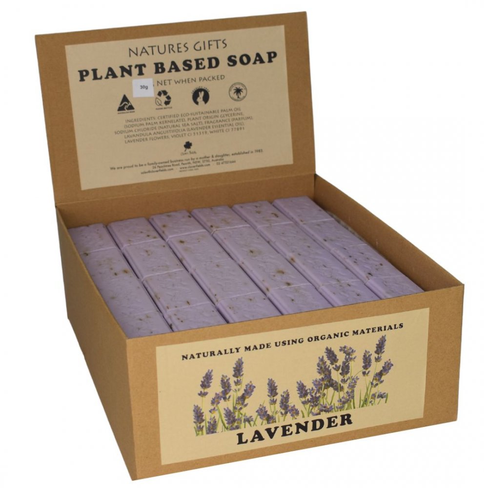 Natures Gifts Plant Based Mini Guest Soap bars. Lavender Flowers to gently massage & invigorate the skin with soothing and calming Lavender Oil. A traditional & aromatic treat that everyone loves.