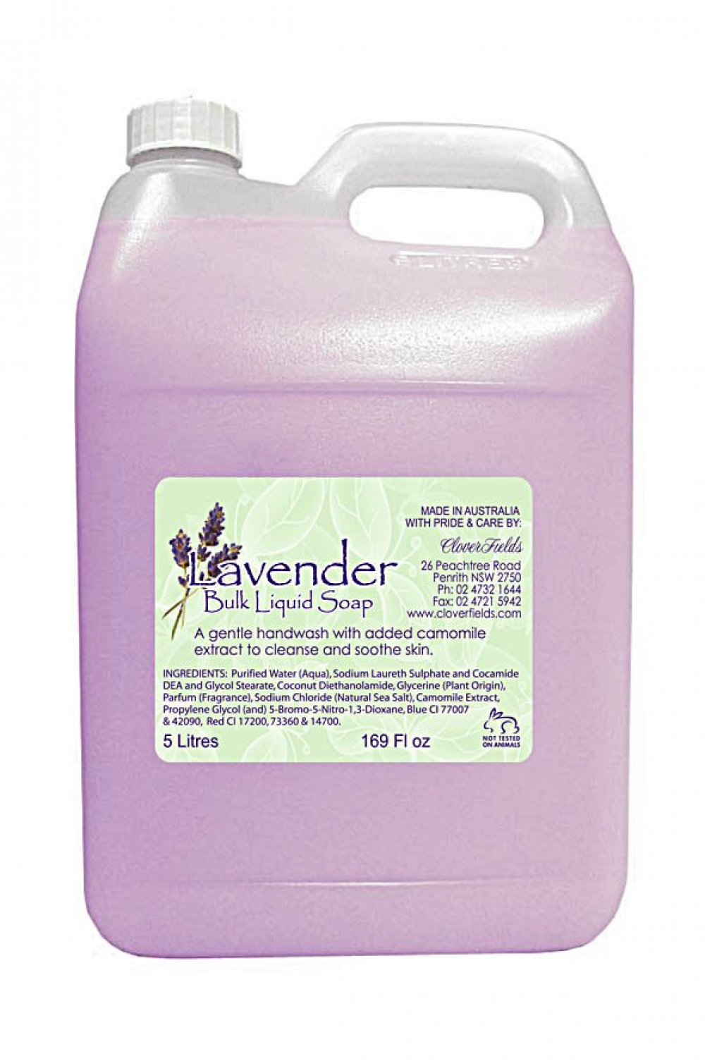 LAVENDER Bulk LIQUID SOAP in an economical 5 litre size to refill your own containers. A great saving!! Check out our 5 litre bottle pump for easy dispensing too. This Liquid Soap is mild and gentle on the skin & suitable for the whole family. Try adding a capful to your washing machine, it saves money and linens smell fantastic. This product can also be used in spa baths. Please start with small quantities on low speed to avoid a frothy nightmare. PLEASE NOTE: Natural colouring is being discontinued from our BULK LIQUIDS. These items will instead show a slight tinge of colour from the natural oils and therefore become mostly clear from October 2024.